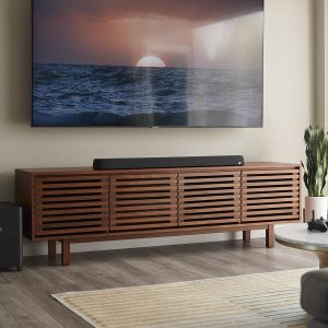 Bármilyen TV-készülékhez beállítható HDMI eARC vagy optikai csatlakozásokon keresztül. (HDMI-kábel mellékelve.) Az intuitív előlapi OLED-kijelző elhalványul, ha nem használja. Ez is Roku TV Ready az egyszerű konfigurálás és vezérlés érdekében. A TV-konzolon található, vagy falra szerelhető. A mellékelt távirányító a dobozból kivéve a legtöbb tévével működik.